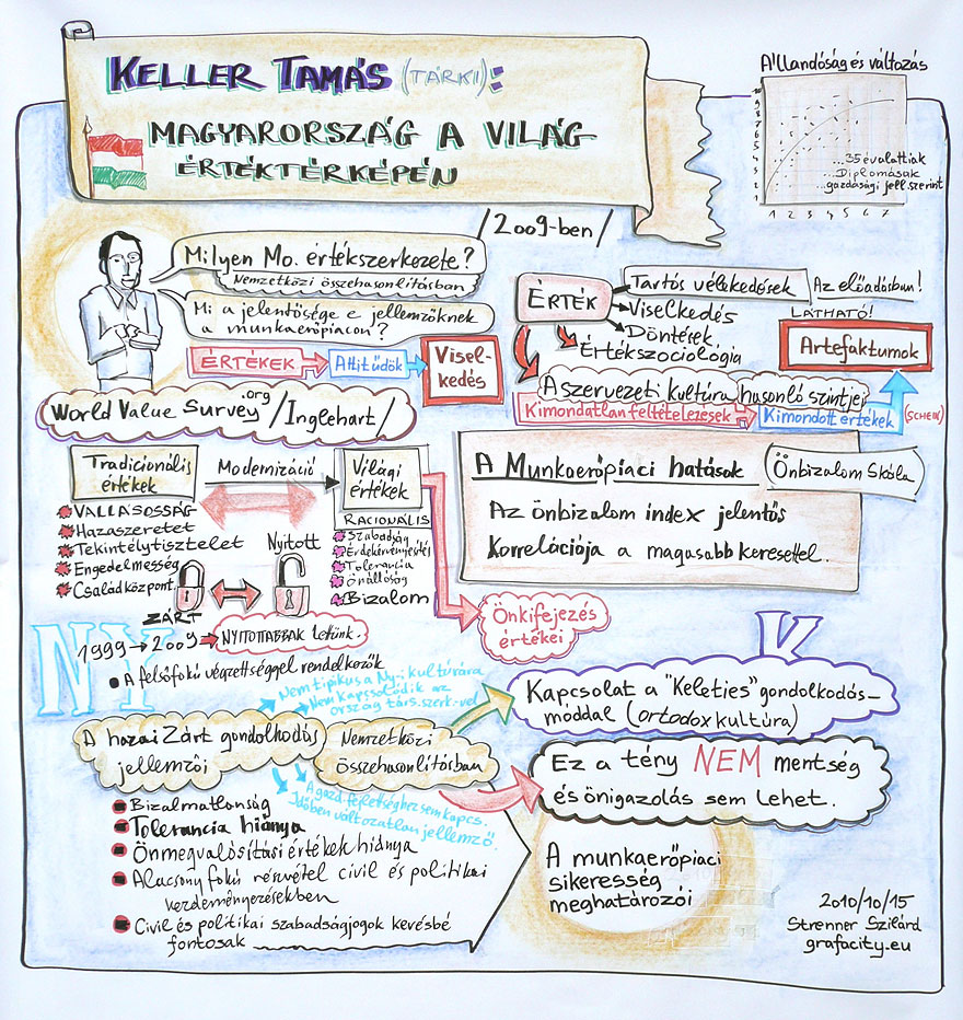 „Szervezetfejlesztők Magyarországi Társaságának konferenciáján elhangzott ’Magyarország a világ értéktérképén’ előadás Strenner Szilárd grafikus (grafacity.eu) interpretációjában.
